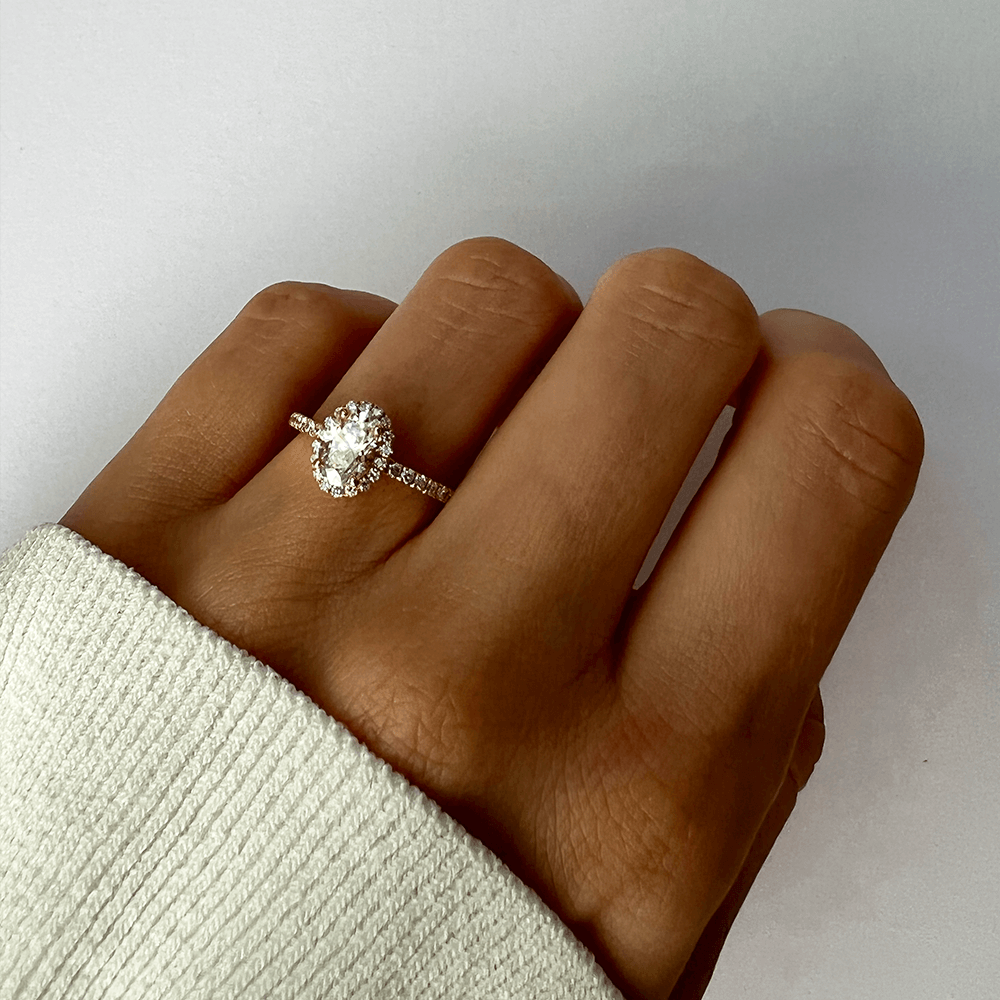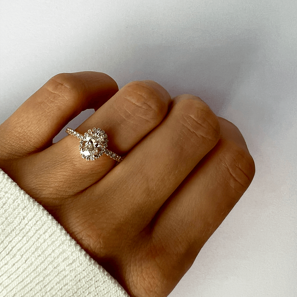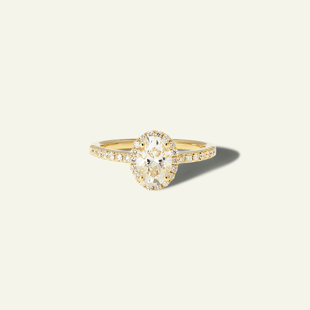 A ring that elongates the look of your finger and has a magic sparkle. Surrounded by pavé-set diamonds and a halo, this stunning engagement ring features a 1-carat oval-cut center stone. The low setting design makes it suitable for everyday wear.