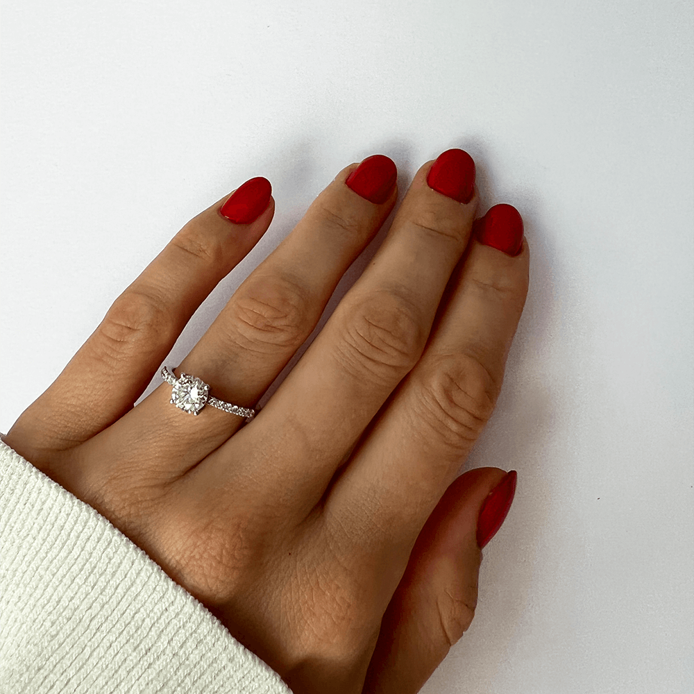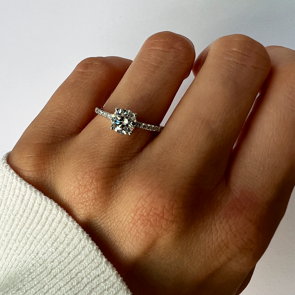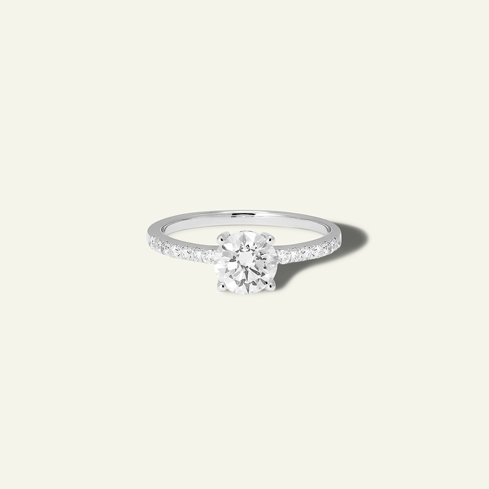 A sophisticated engagement ring featuring a 1-carat brilliant cut center stone with pavé-set diamonds in the band for some extra sparkle.